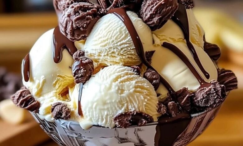 A creamy, indulgent ice cream featuring rich chocolate and peanut butter cups, perfect for satisfying your sweet tooth!