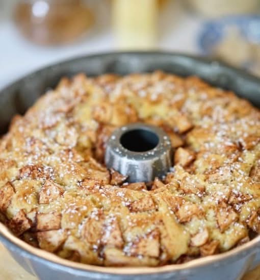The cakeโs structure comes from the chemical reaction between eggs and baking powder, creating air pockets that give rise to a light texture. The Bundt panโs shape helps distribute heat evenly, forming the characteristic golden crust. The apple-cinnamon layers caramelize slightly, creating a naturally sweet mosaic of flavor inside the cake.