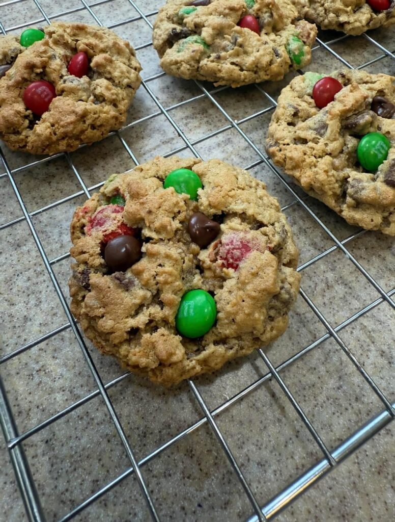 Gently press a few M&M’s into the tops of each cookie for that bakery look.