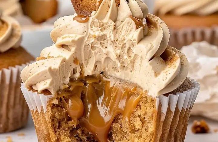 Once the cupcakes are completely cool, pipe the Biscoff buttercream onto the cupcakes using a piping bag with your preferred ti