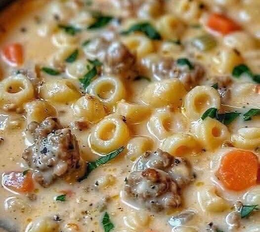 Cheesy Sausage Pasta Soup is a warm, creamy, and comforting dish that blends the hearty flavor of Italian sausage with tender pasta, fresh vegetables, and melted cheese to create a bowl of ultimate comfort. This soup is believed to have originated as a rustic Italian-inspired meal combining the essence of pasta e fagioli and creamy chowder, later adapted in American kitchens to suit family dinners and cozy nights. The history of this recipe is tied to the Italian countryside, where farmers used leftover sausage, cheese, and pasta to create nourishing soups that could feed a large family, transforming humble ingredients into something rich and satisfying.