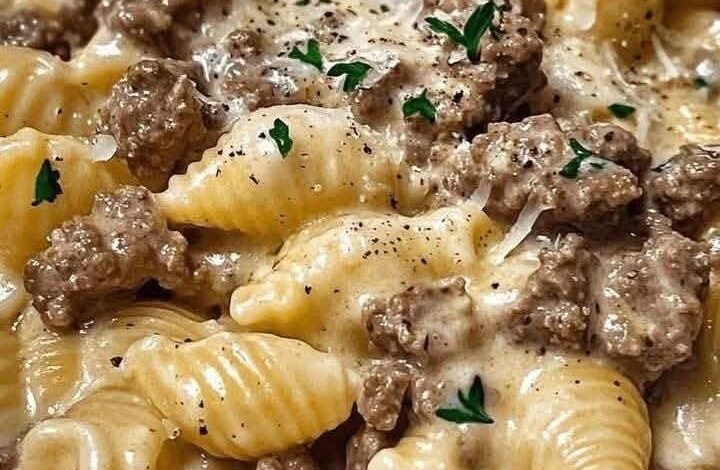 Creamy Beef and Shells in Garlic Parmesan Sauce