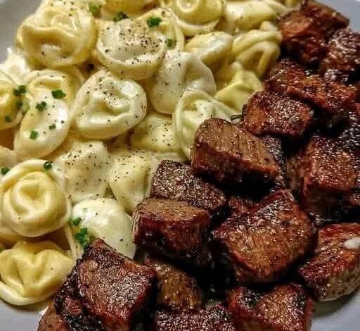 Garlic Butter Steak Bites & Creamy Alfredo Tortellini