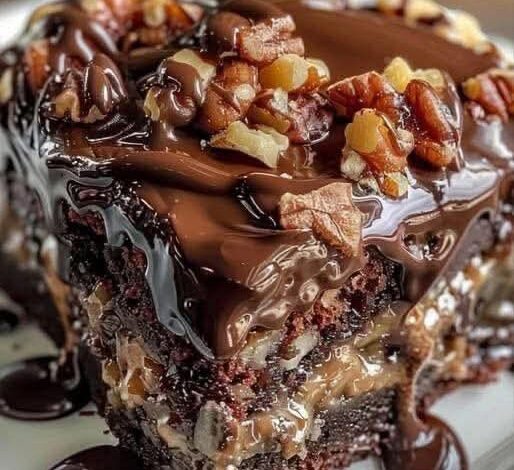 Layer Toppings: Pour sweetened condensed milk, then caramel sauce over the cake. Sprinkle with chocolate chips, shredded coconut, and pecans.