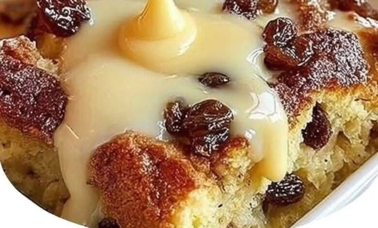 This old-fashioned bread pudding is a heritage dessert created from simple pantry ingredients—bread, milk, sugar, butter, and warm spices. It transforms stale bread into a soft, custardy interior with a lightly caramelized top. The traditional vanilla sauce poured over each serving brings the kind of comfort that has made this recipe beloved for generations.