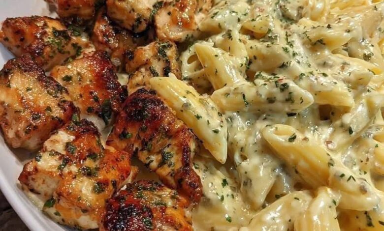 🌟 Grilled Chicken with Creamy Alfredo Penne Pasta