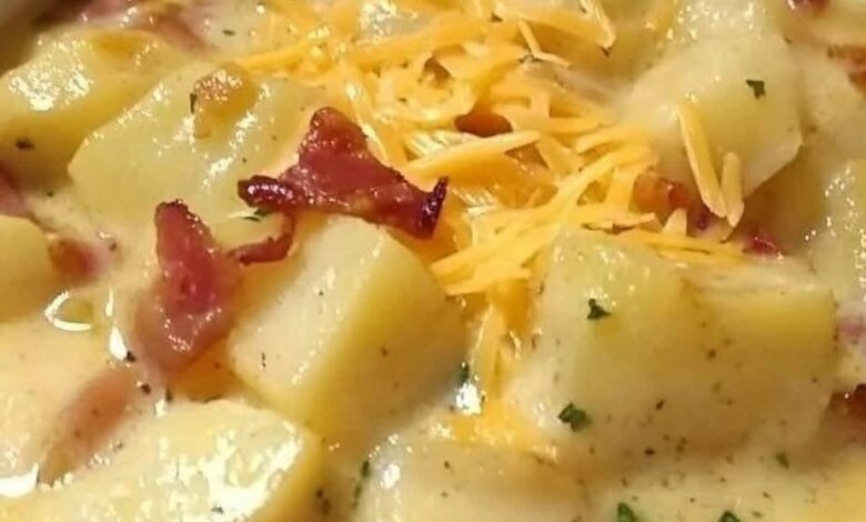 - Mash a few pieces gently against the side of the pot — this helps create a thicker, creamier texture while leaving chunks for that classic loaded potato feel.