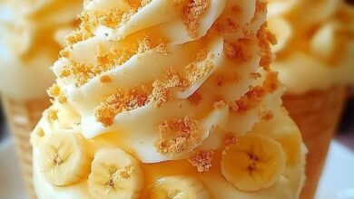 Banana Cheesecake cone Ingredients: – 1 cup graham cracker crumbs – 2 tbsp sugar – 1/4 cup melted butter –…