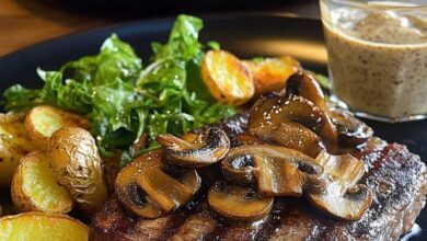 Grilled Steak with Sautéed Mushrooms, Roasted Potato Wedges, and Mixed Green Salad Ingredients: For the Steak and Mushrooms: 1 steak…