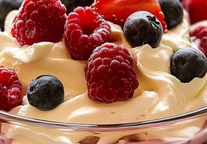 2.2. Top with half of the raspberries, blueberries, strawberries, and mini marshmallows.