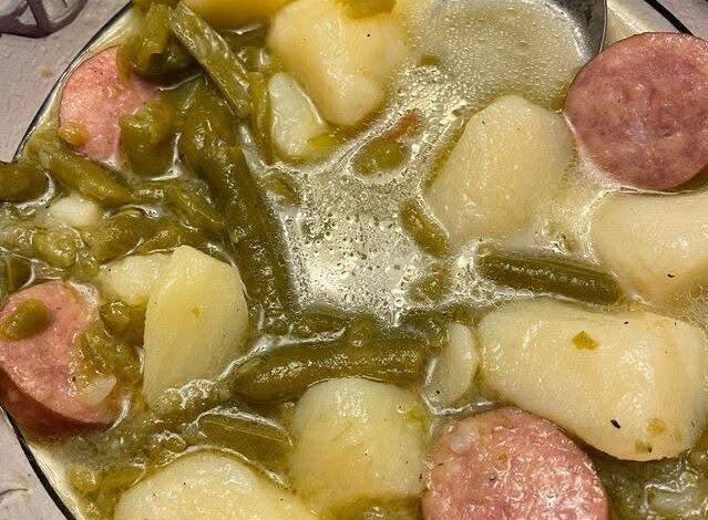 This old-fashioned stew is the definition of comfort food. Tender potatoes, smoky sausage, and fresh green beans are simmered in a flavorful broth that tastes like home. It’s the kind of recipe that’s been passed down through families because it’s inexpensive, nourishing, and stretches to feed a crowd.