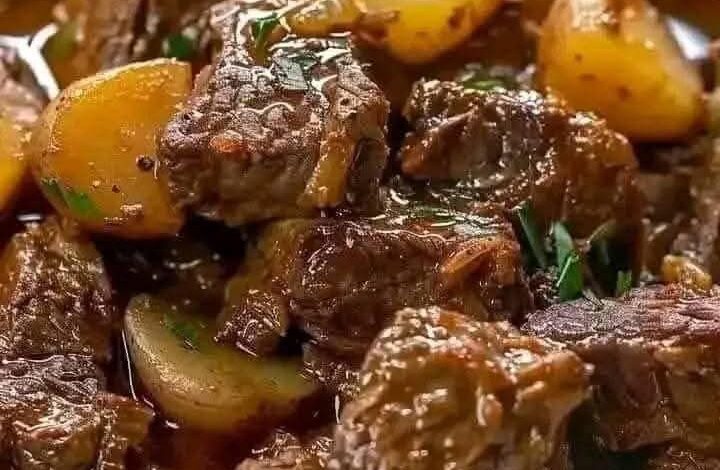 Add tomato sauce, stir to combine. Add 2 cups water, beef cubes and chili, stir. Cover and cook for 40 minutes – 1 hour or until tender. (add water if needed). Add the carrot, potato and cook are soft. Then add the bell peppers and cook for a few minutes until the sauce thickens.