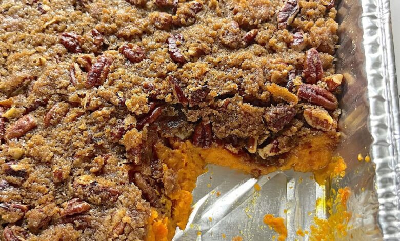 1. In a medium bowl, combine brown sugar, flour, melted butter, and pecans.