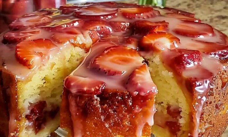 Pour batter into the prepared pan. Arrange a layer of sliced strawberries on top (which will caramelize beautifully as shown in the image).