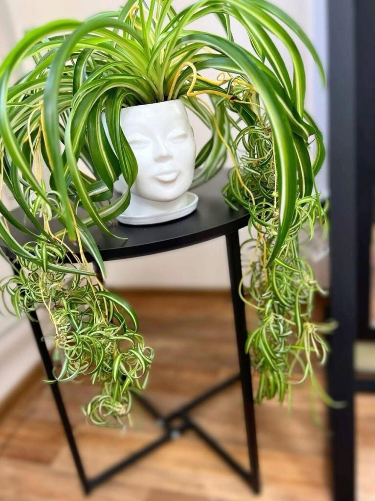 With their fountain-like arching leaves and cascading spiderettes, spider plants bring softness and flow to interior décor. When placed in a hanging basket or a stylish planter, such as the face-shaped pot in your photo, they create a striking, almost whimsical visual effect.