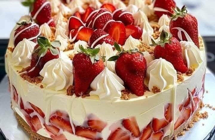 - Before serving, top with fresh strawberries and drizzle with melted white chocolate or sprinkle with shavings.